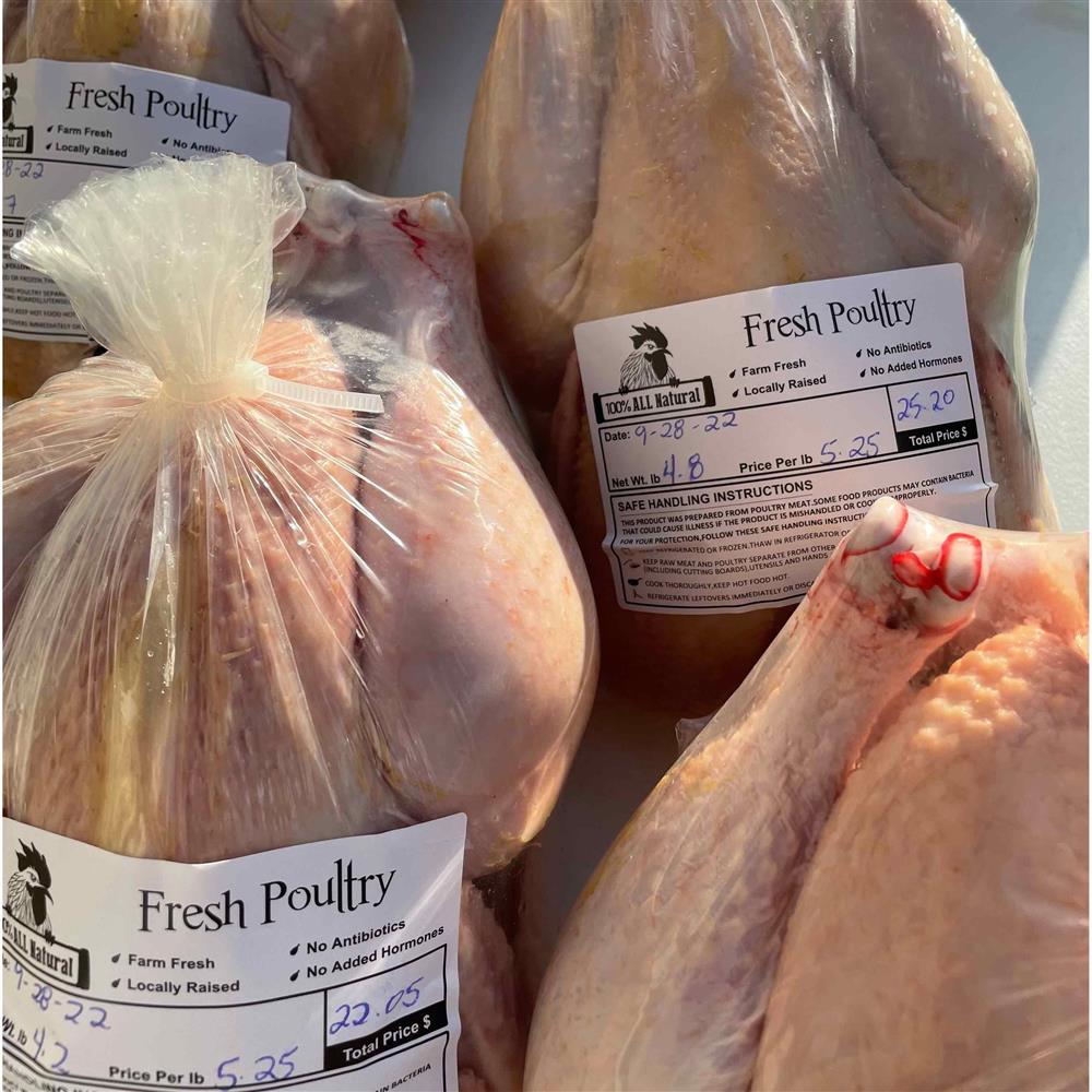 Whole chicken, pastured and fed corn-free, soy-free grain. Butchered on-farm and frozen fresh. Range in weight from 3 to 6 pounds. $6.50 per pound. Please email us to order to get desired weight.
